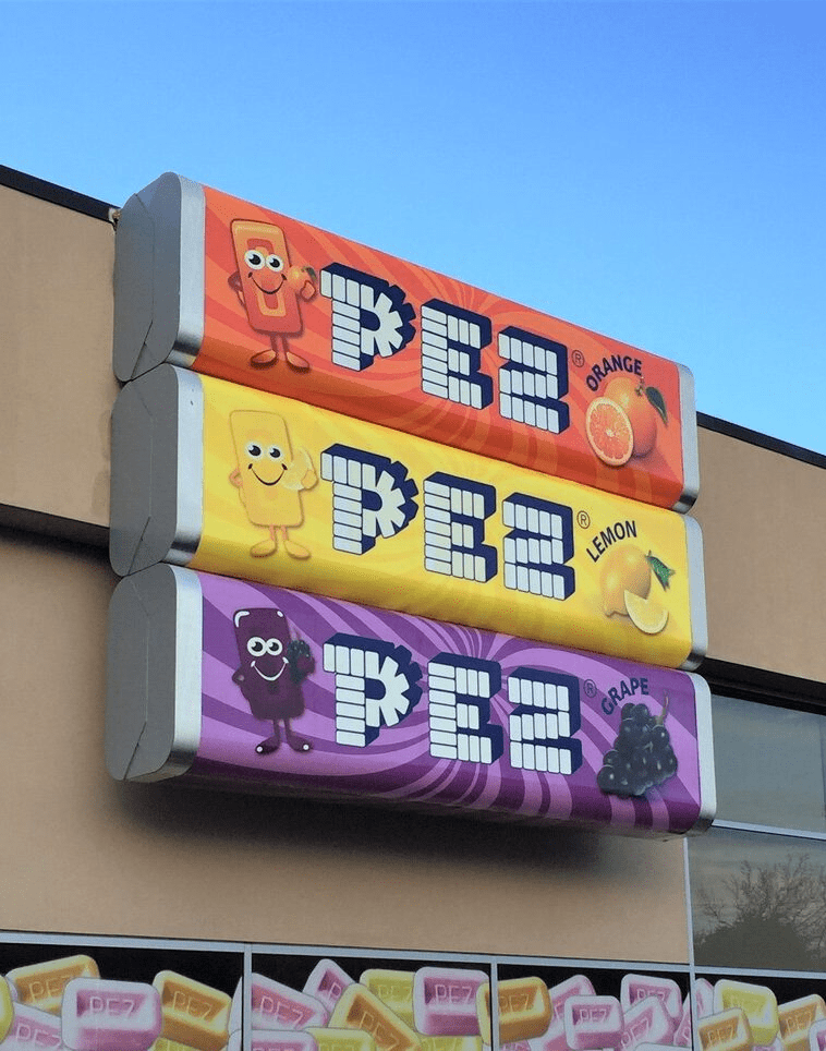 Take your branding to new heights with our stunning architectural signage. Custom-designed to reflect your unique identity. Featured project: The iconic, giant wall sign outside the PEZ headquarters in Milford, CT.